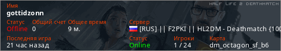 Играет на Half Life 2 DeathMatch сервере. Страна: РоссияПервый раз замечен 19:32 11.03.2026