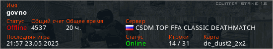 Последний раз был в сети 21:57 23.05.2025 Игрок с таким ником замечен на 22 серверах