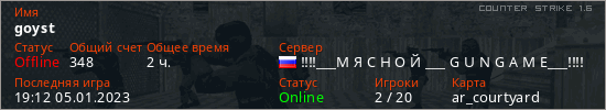 Играет на Counter Strike 1.6 сервере. Страна: РоссияПервый раз замечен 00:18 04.01.2023