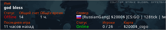 Играет на Counter Strike Global Offensive сервере. Страна: РоссияПервый раз замечен 19:14 26.02.2026