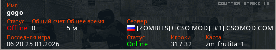 Играет на Counter Strike 1.6 сервере. Страна: РоссияПервый раз замечен 06:18 25.01.2026