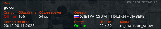 Играет на Counter Strike 1.6 сервере. Страна: РоссияПервый раз замечен 16:18 03.11.2024