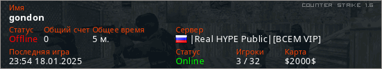 Играет на Counter Strike 1.6 сервере. Страна: РоссияПервый раз замечен 23:52 18.01.2025