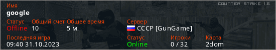 Играет на Counter Strike 1.6 сервере. Страна: РоссияПервый раз замечен 09:25 31.10.2023