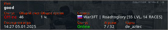 Играет на Counter Strike 1.6 сервере. Страна: РоссияПервый раз замечен 10:00 01.11.2021