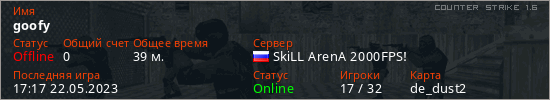 Играет на Counter Strike 1.6 сервере. Страна: РоссияПервый раз замечен 17:15 22.05.2023