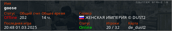 Последний раз был в сети 20:48 01.03.2025 Игрок с таким ником замечен на 22 серверах