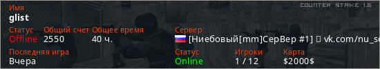 Последний раз был в сети Вчера Игрок с таким ником замечен на 12 серверах