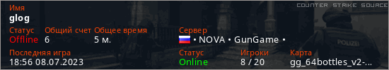 Играет на Counter Strike Source сервере. Страна: РоссияПервый раз замечен 18:41 08.07.2023