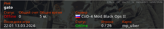 Играет на Call of Duty 4: Modern Warfare сервере. Страна: РоссияПервый раз замечен 21:50 13.03.2026