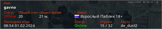 Играет на Counter Strike 1.6 сервере. Страна: РоссияПервый раз замечен 08:45 15.01.2024