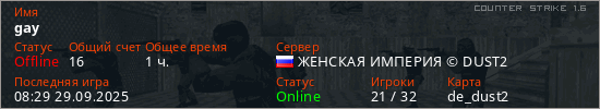 Последний раз был в сети 08:29 29.09.2025 Игрок с таким ником замечен на 34 серверах