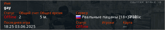 Играет на Counter Strike 1.6 сервере. Страна: РоссияПервый раз замечен 18:23 03.06.2025
