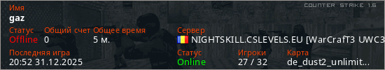 Играет на Counter Strike 1.6 сервере. Страна: РумынияПервый раз замечен 20:50 31.12.2025
