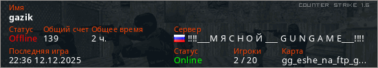 Играет на Counter Strike 1.6 сервере. Страна: РоссияПервый раз замечен 12:18 16.07.2022