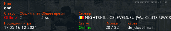 Играет на Counter Strike 1.6 сервере. Страна: РумынияПервый раз замечен 16:53 16.12.2024