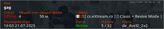 Играет на Counter Strike 1.6 сервере. Страна: РумынияПервый раз замечен 09:42 01.06.2025