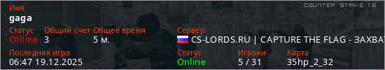 Играет на Counter Strike 1.6 сервере. Страна: РоссияПервый раз замечен 06:40 19.12.2025