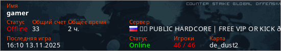 Играет на Counter Strike Global Offensive сервере. Страна: РоссияПервый раз замечен 20:32 20.07.2025