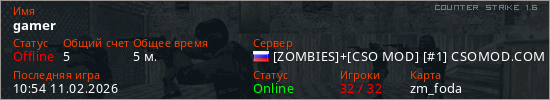 Играет на Counter Strike 1.6 сервере. Страна: РоссияПервый раз замечен 10:31 11.02.2026