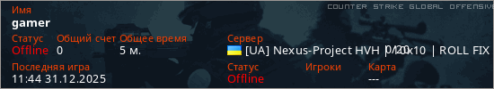 Играет на Counter Strike Global Offensive сервере. Страна: УкраинаПервый раз замечен 11:42 31.12.2025