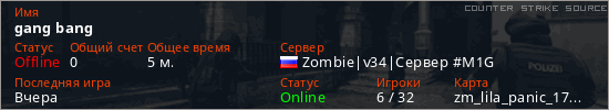 Играет на Counter Strike Source сервере. Страна: РоссияПервый раз замечен 14:29 11.12.2025