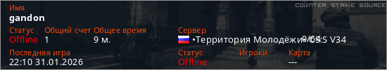 Играет на Counter Strike Source сервере. Страна: РоссияПервый раз замечен 21:28 31.01.2026