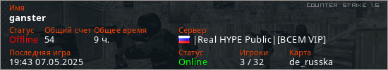Играет на Counter Strike 1.6 сервере. Страна: РоссияПервый раз замечен 11:19 25.12.2024