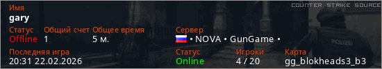 Играет на Counter Strike Source сервере. Страна: РоссияПервый раз замечен 20:29 22.02.2026