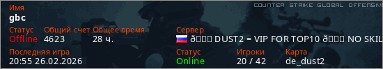 Играет на Counter Strike Global Offensive сервере. Страна: РоссияПервый раз замечен 16:22 08.07.2025