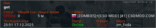 Играет на Counter Strike 1.6 сервере. Страна: РоссияПервый раз замечен 23:49 17.12.2025