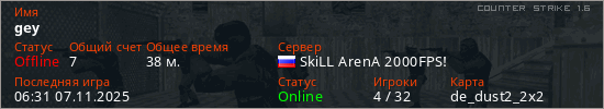 Играет на Counter Strike 1.6 сервере. Страна: РоссияПервый раз замечен 23:24 28.11.2022