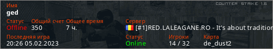 Играет на Counter Strike 1.6 сервере. Страна: РумынияПервый раз замечен 16:36 29.01.2023