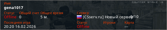 Играет на Counter Strike 1.6 сервере. Страна: РоссияПервый раз замечен 19:45 16.02.2026
