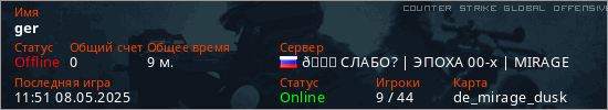 Играет на Counter Strike Global Offensive сервере. Страна: РоссияПервый раз замечен 08:23 05.05.2025