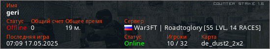 Играет на Counter Strike 1.6 сервере. Страна: РоссияПервый раз замечен 05:44 17.05.2025