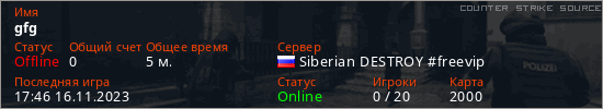 Играет на Counter Strike Source сервере. Страна: РоссияПервый раз замечен 17:42 16.11.2023