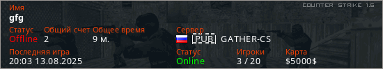 Играет на Counter Strike 1.6 сервере. Страна: РоссияПервый раз замечен 19:01 13.08.2025