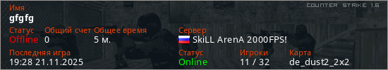 Играет на Counter Strike 1.6 сервере. Страна: РоссияПервый раз замечен 19:26 21.11.2025