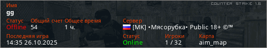 Играет на Counter Strike 1.6 сервере. Страна: РоссияПервый раз замечен 18:18 04.07.2023