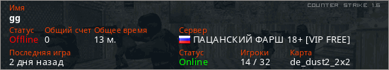 Играет на Counter Strike 1.6 сервере. Страна: РоссияПервый раз замечен 19:01 17.02.2026