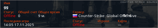 Играет на Counter Strike Source сервере. Страна: РоссияПервый раз замечен 12:27 17.11.2025