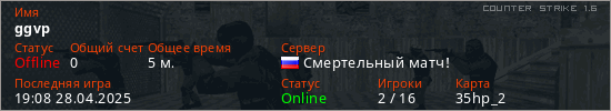 Играет на Counter Strike 1.6 сервере. Страна: РоссияПервый раз замечен 19:06 28.04.2025