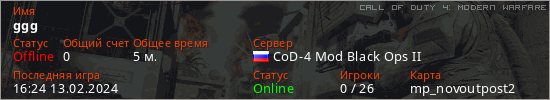 Играет на Call of Duty 4: Modern Warfare сервере. Страна: РоссияПервый раз замечен 16:20 13.02.2024