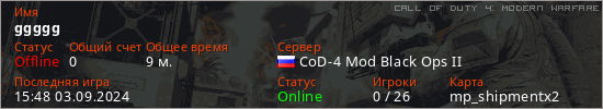 Играет на Call of Duty 4: Modern Warfare сервере. Страна: РоссияПервый раз замечен 12:23 14.05.2024