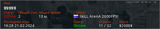 Играет на Counter Strike 1.6 сервере. Страна: РоссияПервый раз замечен 18:31 03.12.2022