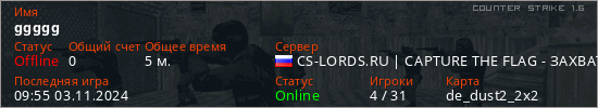 Играет на Counter Strike 1.6 сервере. Страна: РоссияПервый раз замечен 09:53 03.11.2024