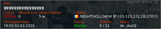 Последний раз был в сети 19:50 02.02.2026 Игрок с таким ником замечен на 5 серверах