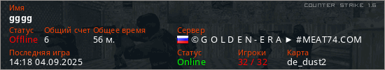 Играет на Counter Strike 1.6 сервере. Страна: РоссияПервый раз замечен 18:50 20.02.2024