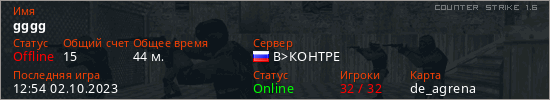 Играет на Counter Strike 1.6 сервере. Страна: РоссияПервый раз замечен 13:13 23.10.2022